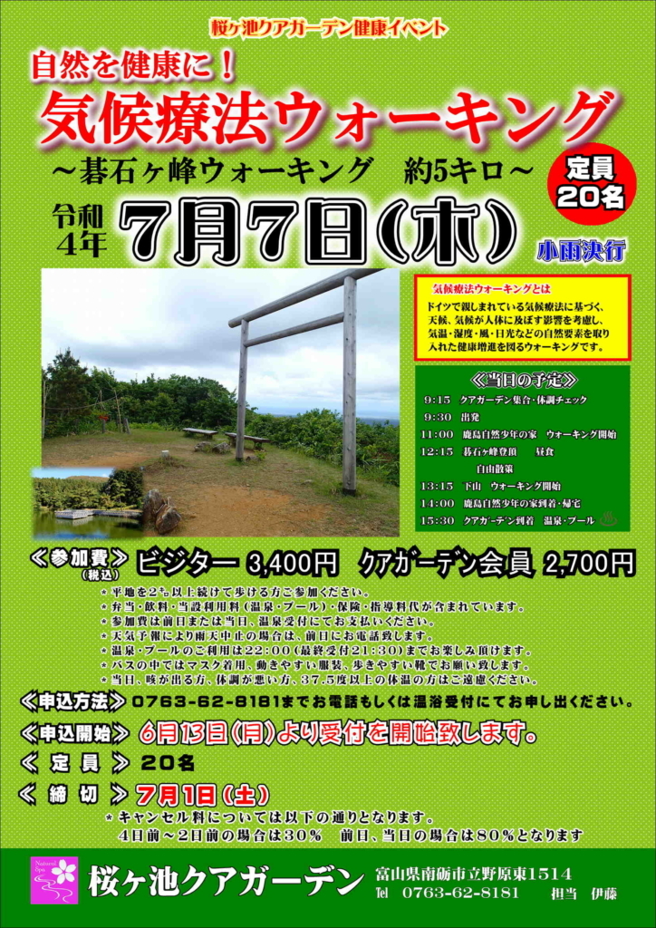 気候療法ウォーキングイベント再開こんにちは、桜ヶ池クアガーデンです。 約2年ぶりの気候療法ウォーキングイベントを再開いたします。 今回は碁石ヶ峰ウォーキングとなります。高低差も少なく気軽にご参加できると思います。