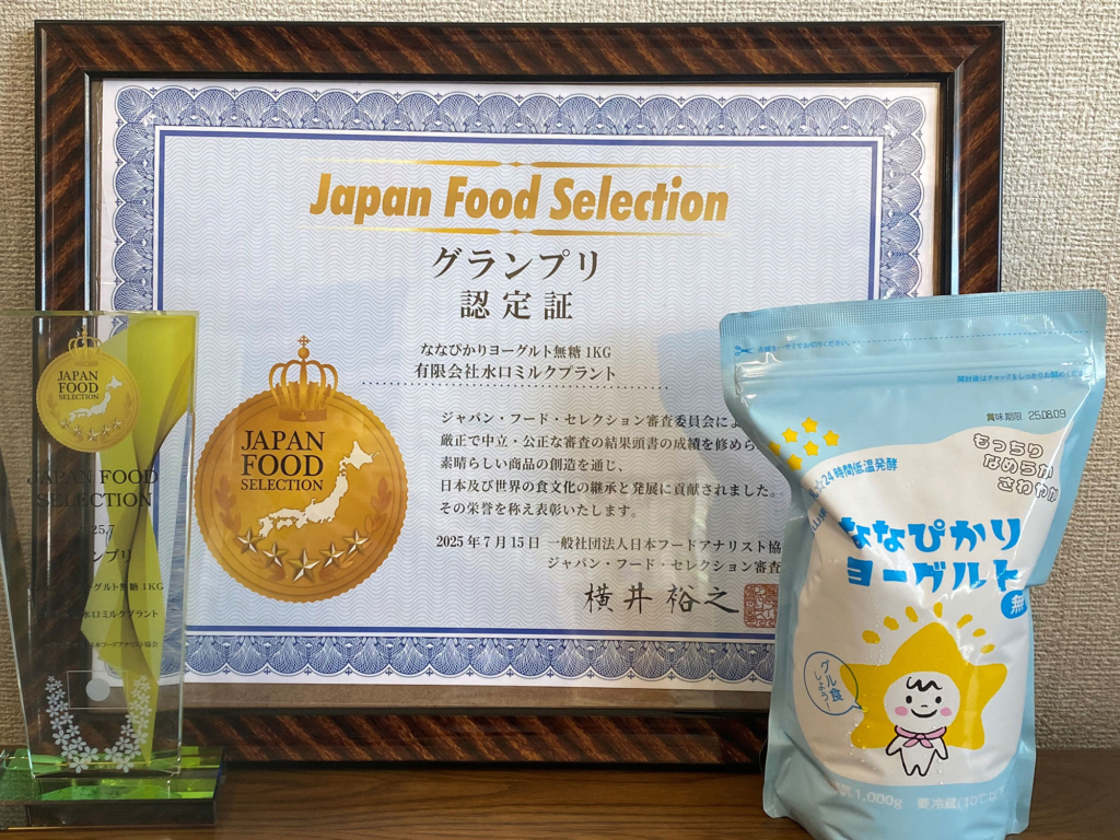 朝食でご提供の地元ヨーグルトがジャパン・フード・セレクションのグランプリに認定体に優しい地元食材の朝食にこだわる当館にとって嬉しいお知らせが届きました。 朝食でご提供する「ななぴかりヨーグルト」が、日本フードアナリスト協会(東京)のジャパン・フード・セレクション(食品・飲料水