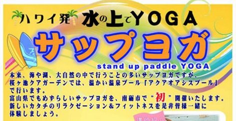温泉プールでサップヨガ体験会!参加者募集 11/23(水・祝)・27(日)県内でもめずらしい、今ブームの「サップヨガ」が クアガーデンで行われます。参加者募集!! 水の上で行うヨガです。 詳しくはチラシを見てくださいね。 温泉プールでサップヨガ体験会