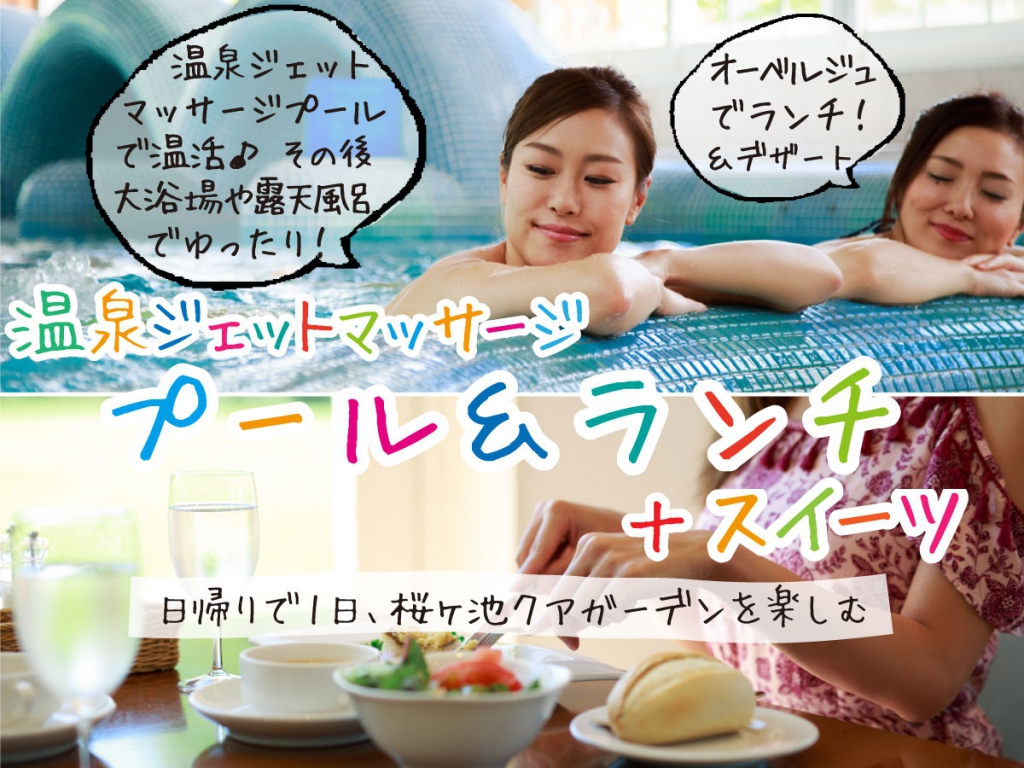日帰りで1日桜ヶ池クアガーデンを楽しめる【日帰りプール&ランチ】プランが誕生温泉ジェットマッサージプールにオーベルジュレストランでのランチとスイーツがセットになって、桜ヶ池クアガーデンを1日楽しめるお得な日帰りプランをぜひご利用ください ☆温泉ジェットマッサージ