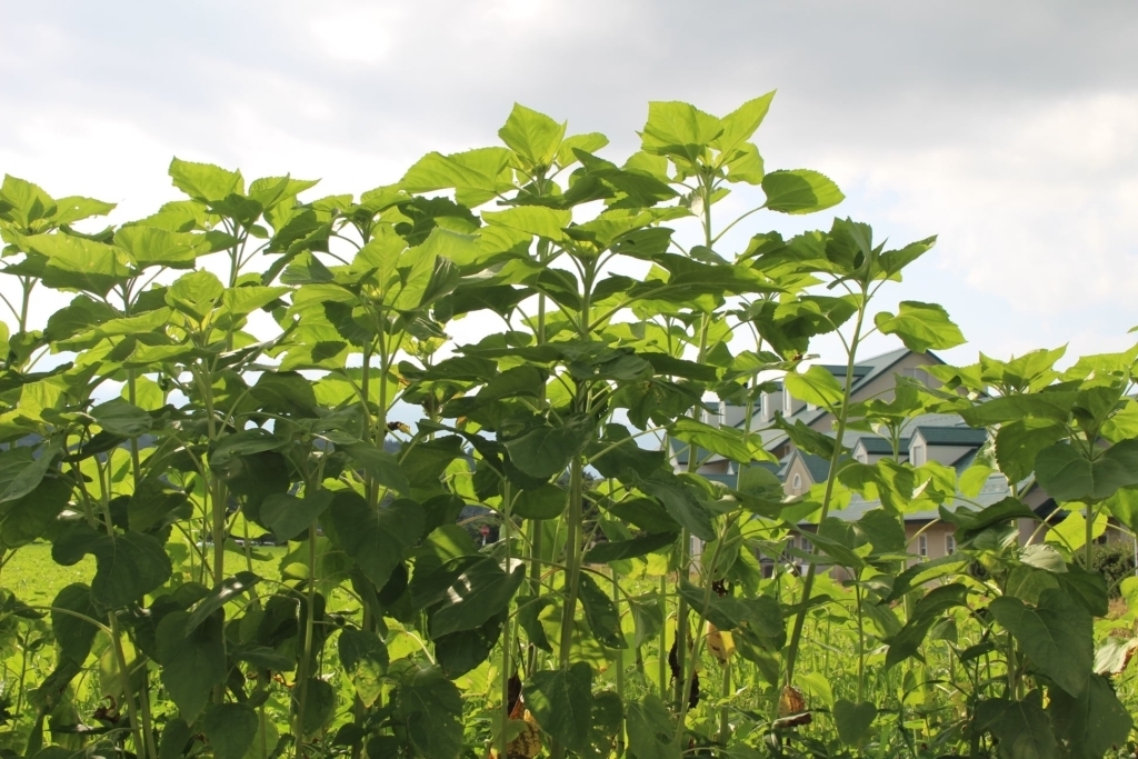 ひまわり日記 ただいま生育中こんにちは。桜ヶ池クアガーデンの西川です。 現在のひまわり畑の状況です。 今のところまだ、お花は咲いていません。 これからが楽しみです (今年の開花は8/20頃の予定)