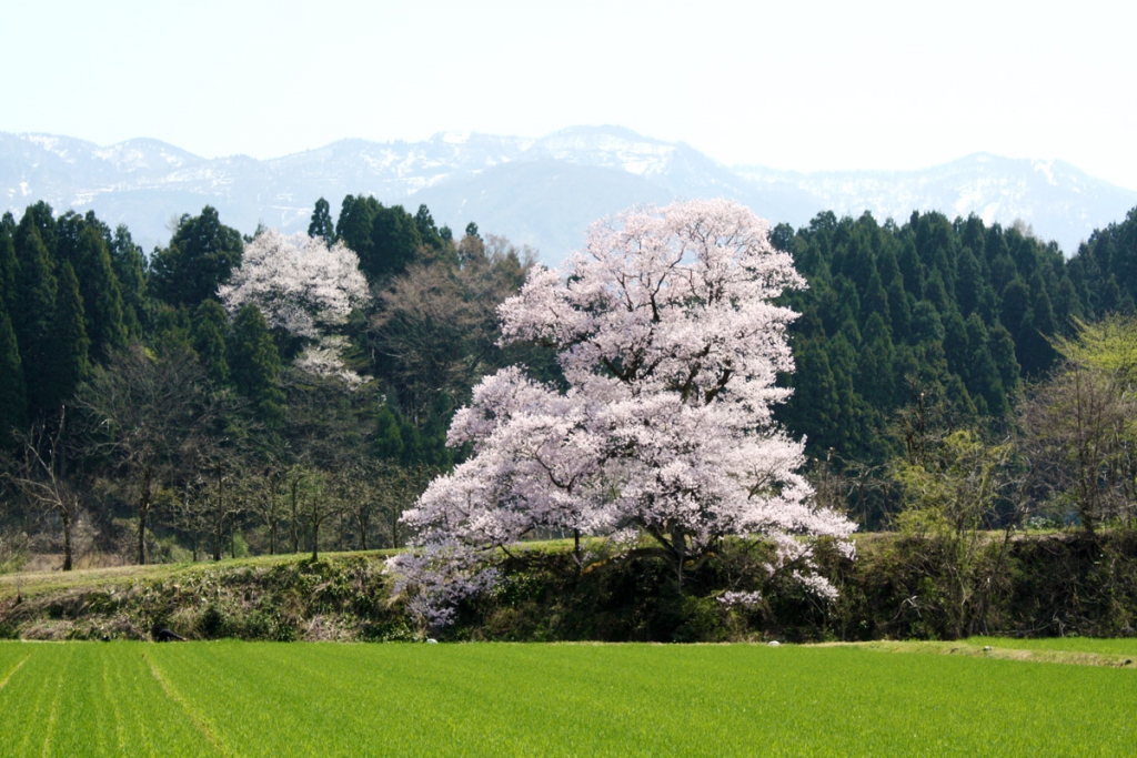 4月上旬~中旬 向野のエドヒガン桜▶︎戦時中に蒔になることを逃れ、 田に1本だけ残る大桜。 北陸屈指の一本桜として、多くの人が訪れる。 山田川の堤防にあり、樹齢100年を超えると言われる江戸彼岸桜(エドヒガン桜)の大木で