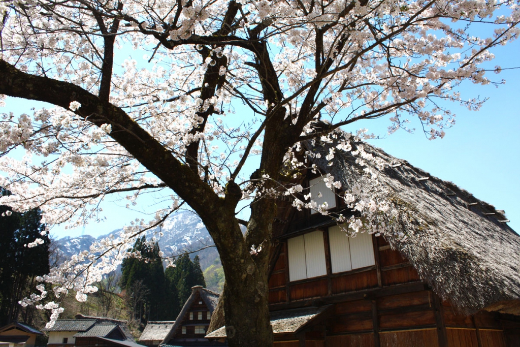 4月中旬~下旬 世界遺産五箇山・菅村の桜と残雪▶︎菅沼集落で桜が咲く頃、相倉集落では 田んぼに雪が残り、五箇山では 春の訪れと冬の終わりを一度に感じられます。 世界遺産・五箇山の合掌造り集落の〈菅沼〉と〈相倉〉では、標高差が200m