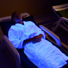海中をイメージさせたブルーライトの休息室に、約5ミクロンの海水の微粒子が漂う空間で、極上の休息タイム。