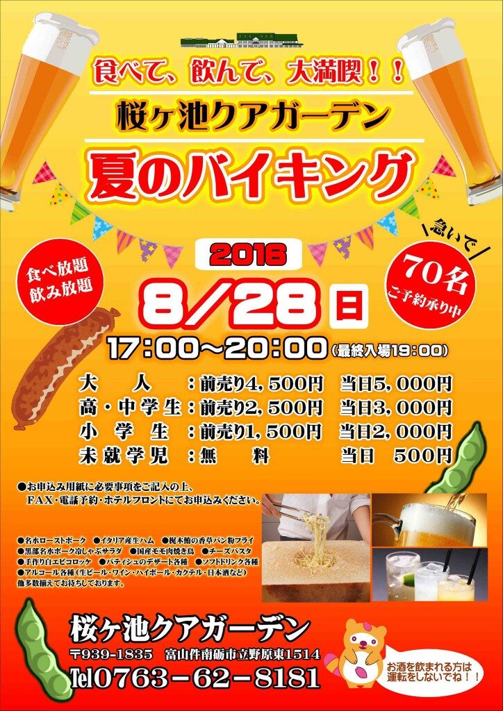 8/28(日)夏のバイキング!参加者募集!!こんにちは桜ヶ池クアガーデンです。 8月28日(日) 桜ヶ池クアガーデンでは、 夏のバイキングを行います。 家族で!カップルで!!お友達で!!! おいしい料理を揃えてお持ちしております。 前
