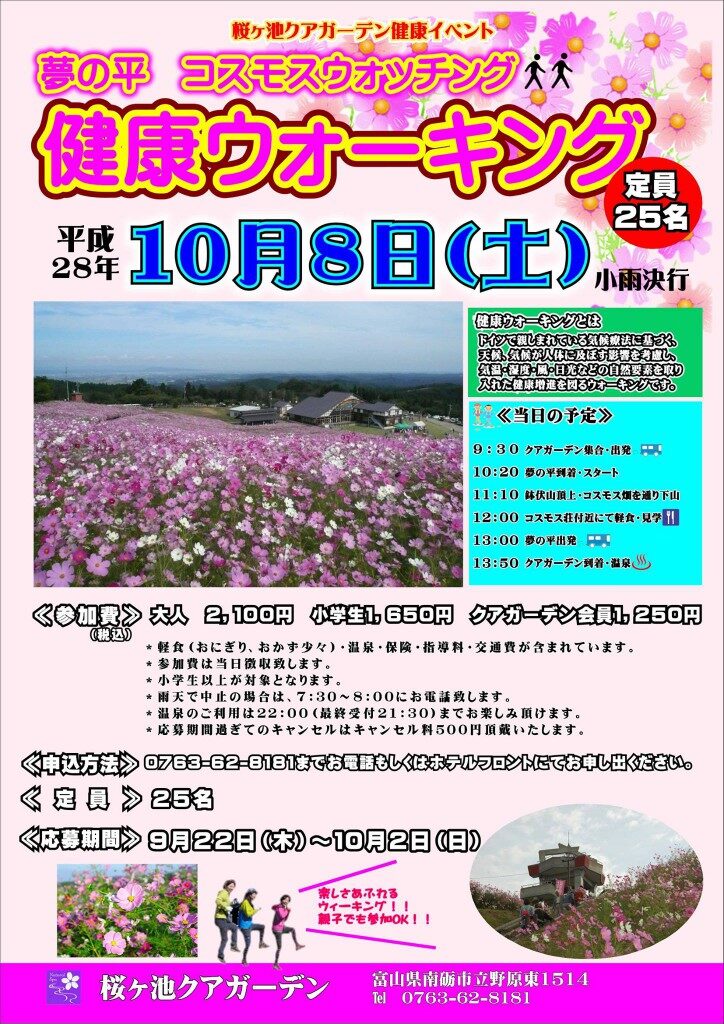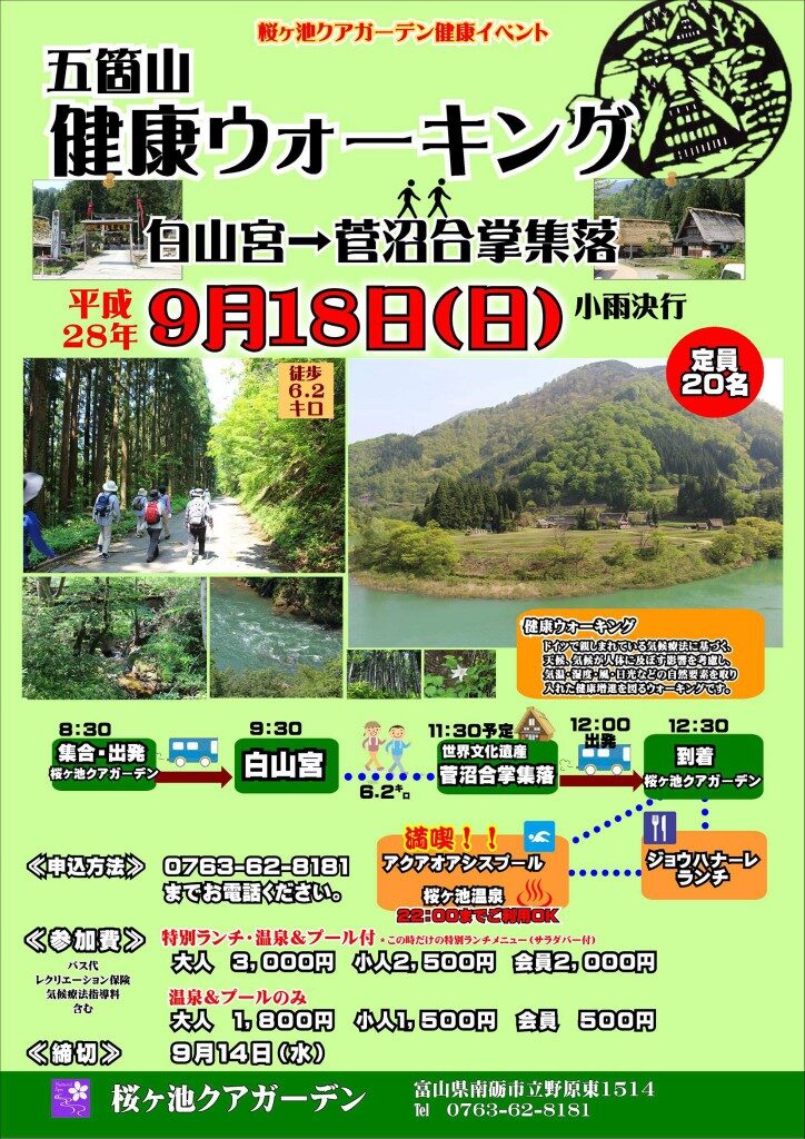 9/18(日)「健康ウォーキングin五箇山」参加者募集こんにちは、桜ヶ池クアガーデンです。 少し涼しくなってきましたね。 もうすぐ秋です。運動もしやすくなる季節。 またまた、やっちゃいます! 桜ヶ池クアガーデン健康イベント 「健康ウォーキン