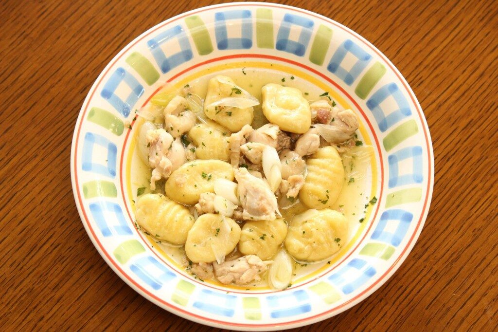 本日のシェフの気まぐれパスタ「さつまいものニョッキ」こんにちは、桜ヶ池クアガーデンです。 本日のシェフの気まぐれパスタは!!! 「さつまいものニョッキ とり肉と白ネギソース」 となっております。 さつまいもを練りこんだニョッキはもち