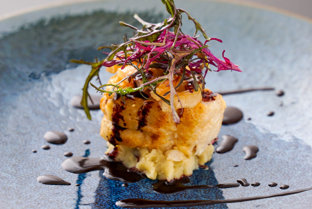 アンコウと石黒種麹店の塩麹 赤ワインソース さつま芋と蓮根