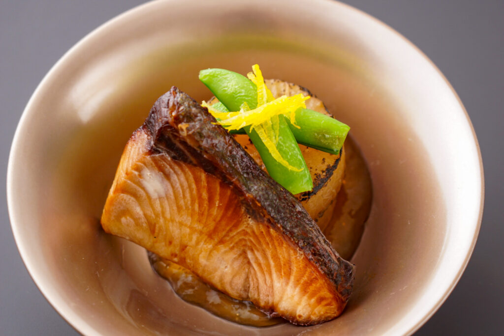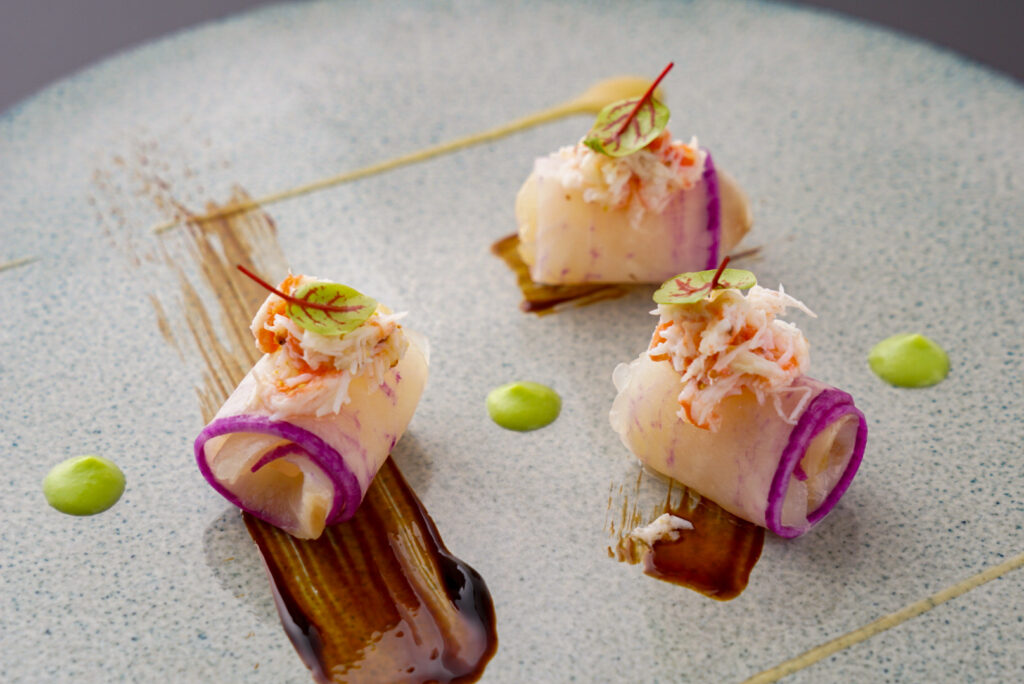 ガンド鰤のスモークと紅しぐれ大根 ズワイガニのタルタル