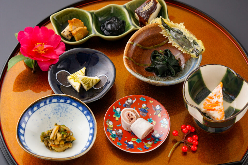 白貝松前漬け 蕪寿司 真イカ黒造り 五箇山豆腐田楽 ローストビーフ千枚巻